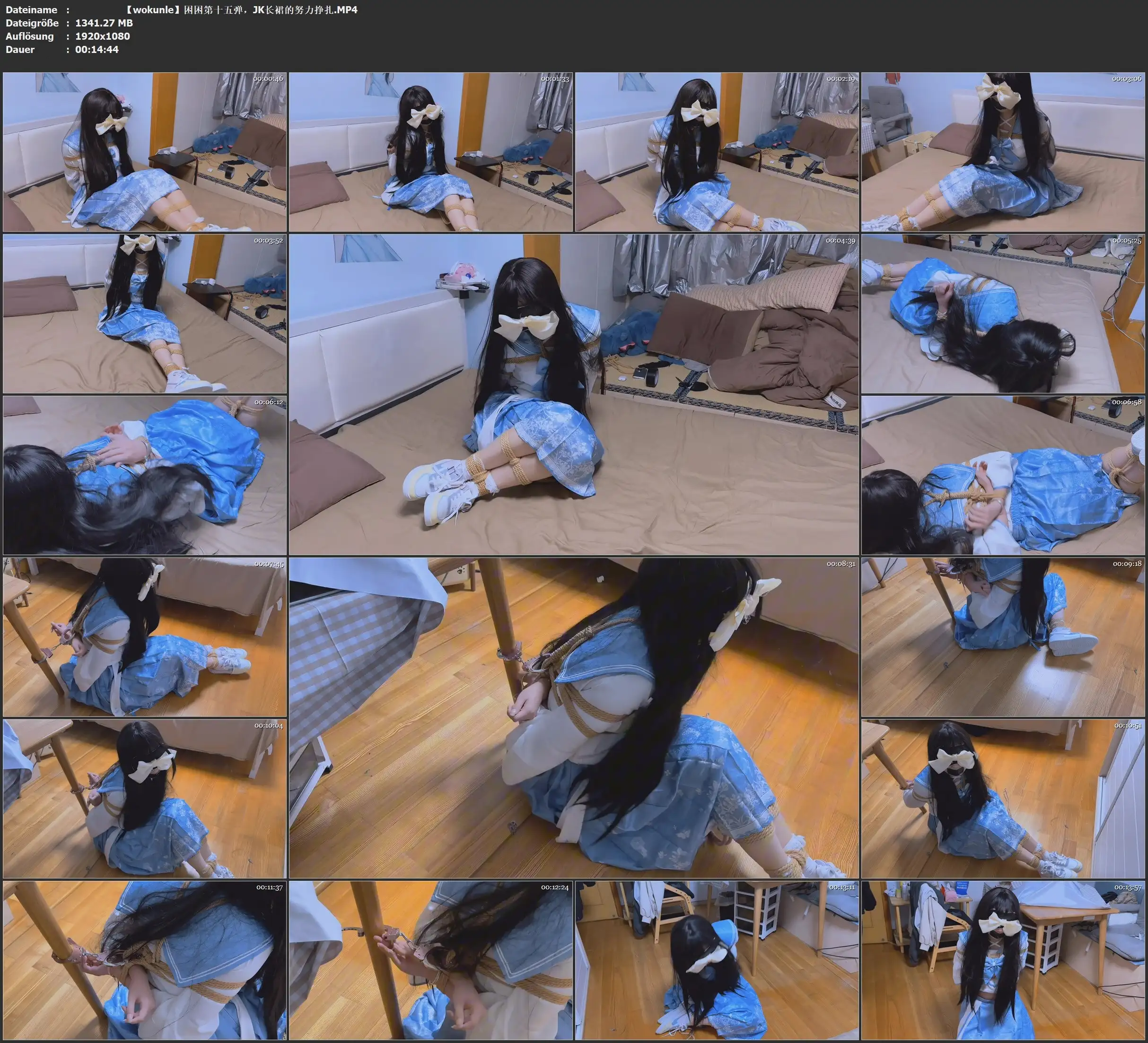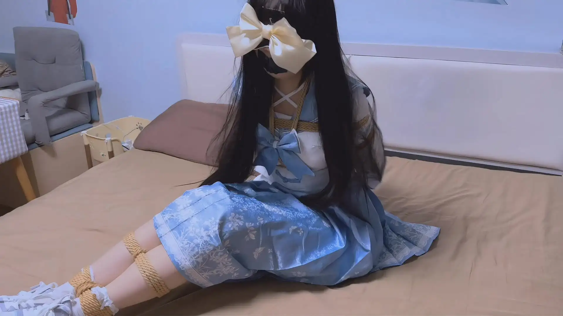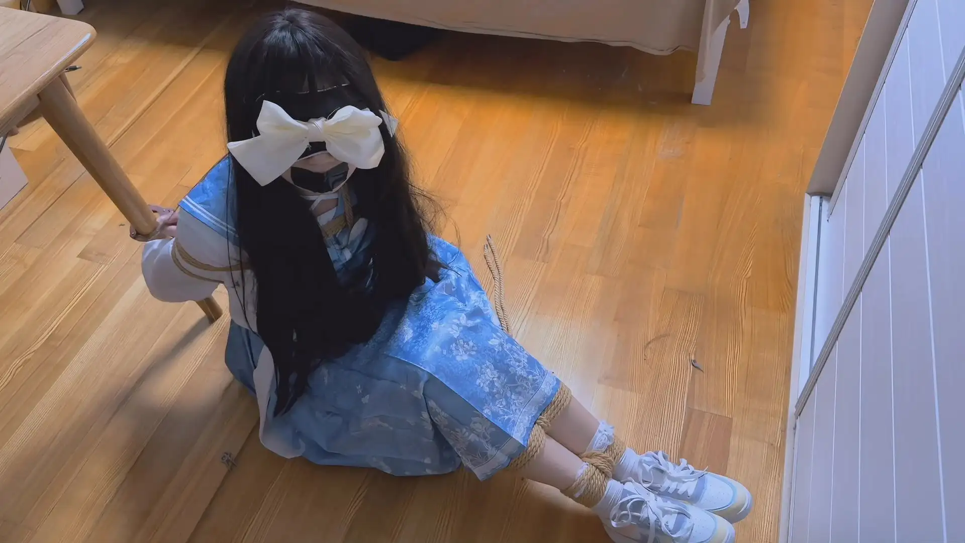 这几天真的被捆了好几次,这次是另一套的JK长蓝裙,闺蜜还是一如即往地绑得很紧,虽然不至于难受,但想要挣脱开还是不太现实,而且我看是长裙,以为就不用绑大腿了(反正视频里也看不到…),结果闺蜜还是很认真地把大腿捆了两道……一开始看我在床上挣扎还不够,竟然还用手铐把我铐在桌子旁边,然后把钥匙丢在旁边,拜托我眼睛被蒙着根本摸不到钥匙TAT,尝试了好多次都以失败告终,虽然最后还是把钥匙给了困困,但解开手铐到底有什么意义啊,绳子还绑着呢
